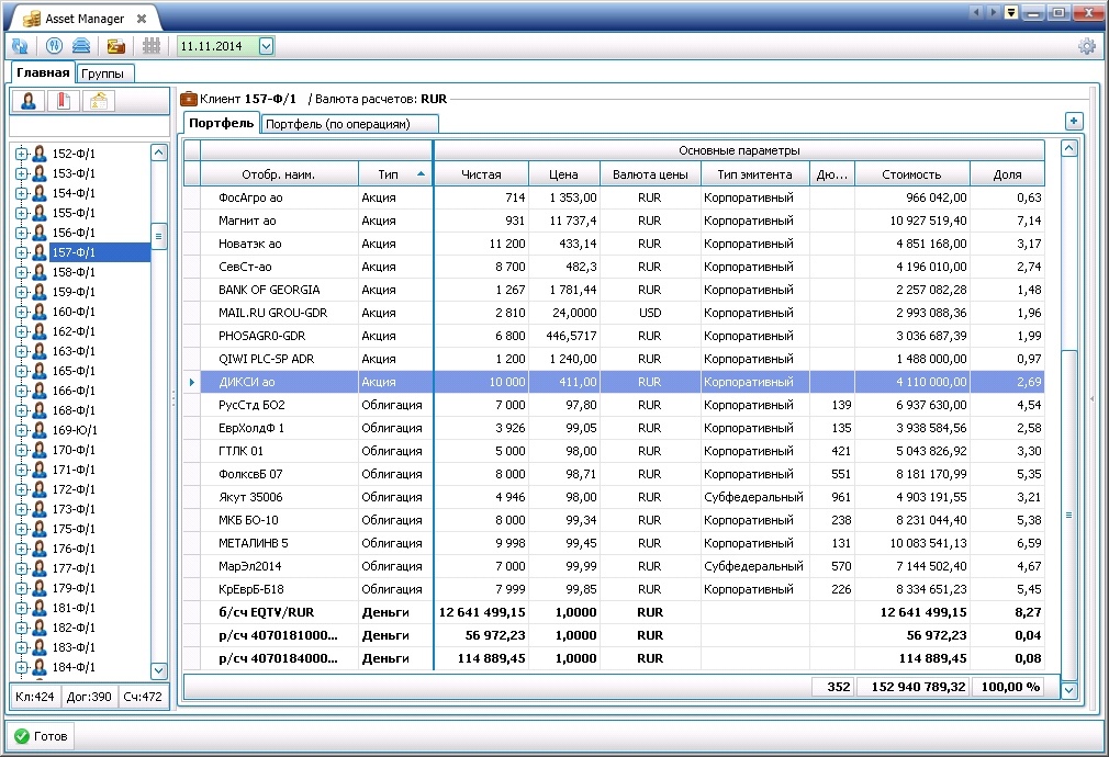 - Расчет суммарного портфеля компании с автоматической группировкой по клиентам и договорам клиентов с учетом внебиржевых сделок, денежных позиций на брокерских и расчетных счетах, банковских депозитов.
