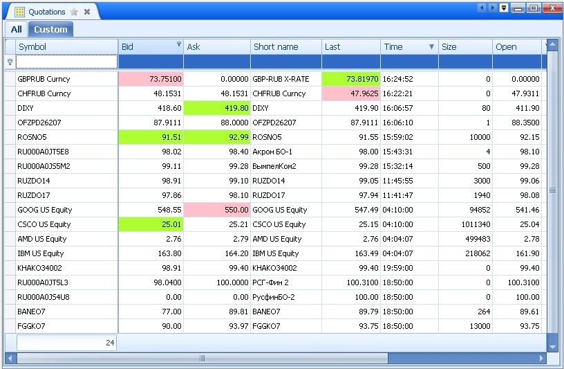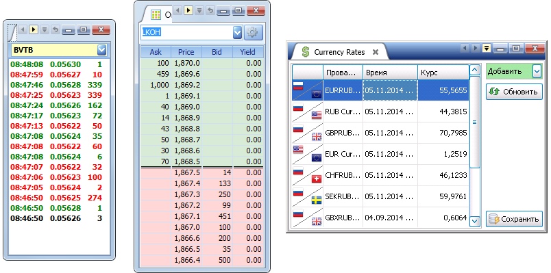 - Получение текущих рыночных котировок инструментов (Level1 и Level2).