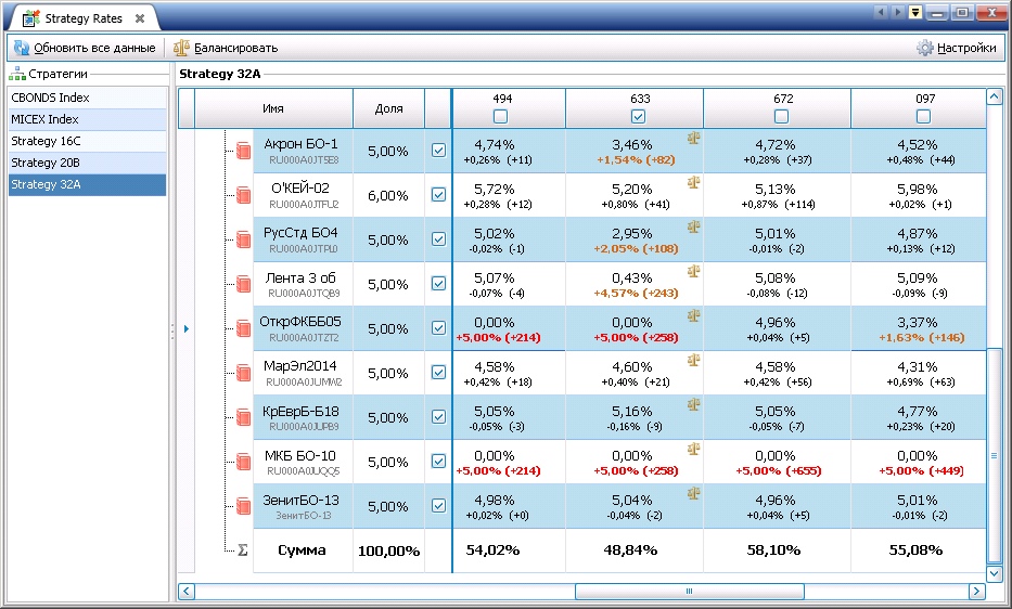 - Ребалансировка портфелей: расчет отклонения текущих клиентских портфелей от стратегий и создание набора торговых заявок, обеспечивающих приведение клиентских портфелей к модельным.